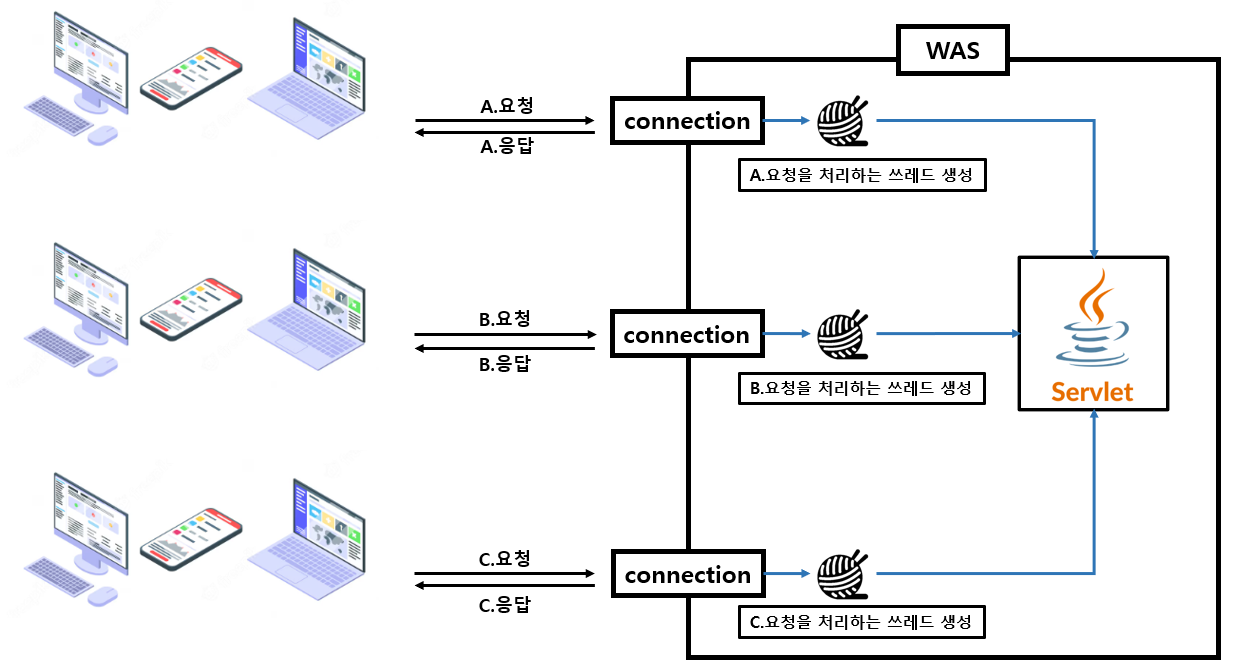 쓰레드를 동시에 처리하는 멀티 쓰레드는 WAS에서 지원을 해주기 때문에 어플리케이션을 개발할 때는 멀티 쓰레드에 대해서 신경쓰지 않아도 된다.