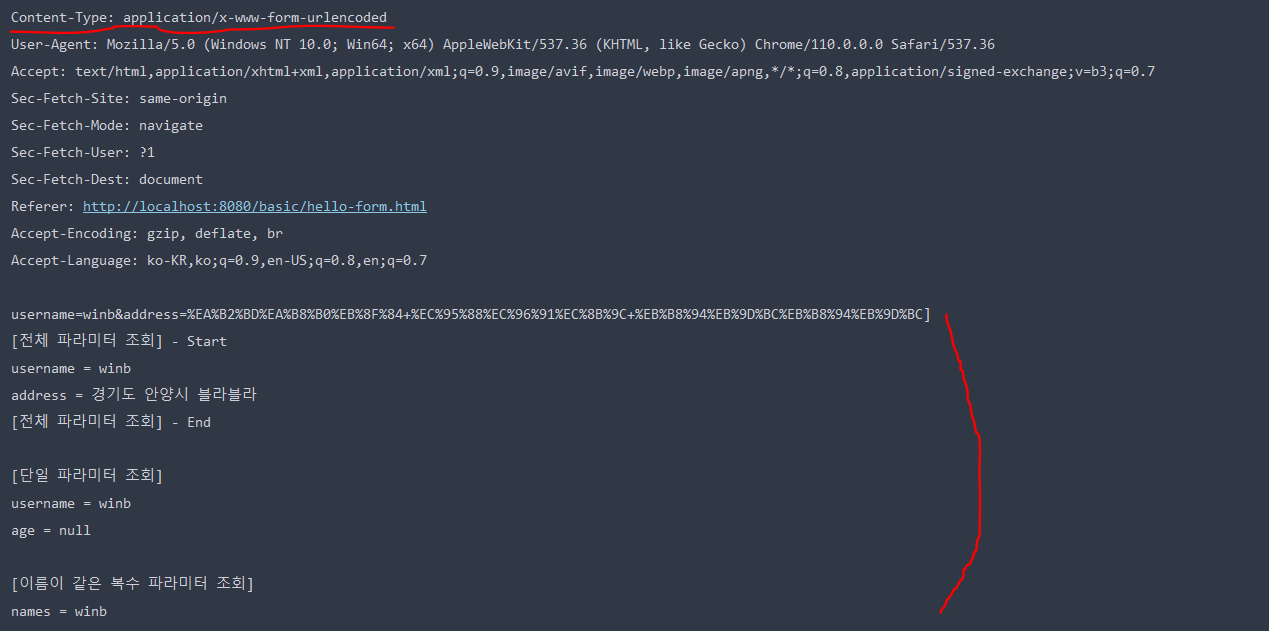 content-type은 HTTP 메시지 바디의 데이터 형식을 지정한다. GET URL 쿼리 파라미터 형식으로 클라이언트에서 서버로 데이터를 전달할 때는 HTTP 메시지 바디를 사용하지 않기 때문에 content-type이 없다. POST HTML Form 형식으로 데이터를 전달하면 HTTP 메시지 바디에 해당 데이터를 포함해서 보내기 때문에 바디에 포함된 데이터가 어떤 형식인지 content-type을 꼭 지정해야 한다. 이렇게 폼으로 데이터를 전송하는 형식을 application/x-www-form-urlencoded 라 한다.