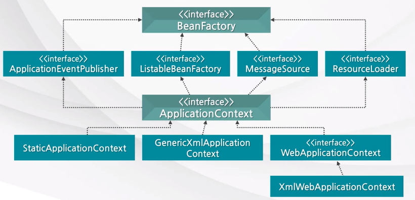 Spring DI 컨테이너가 관리하는 객체를 빈(Bean) 이라고 하며, 이 빈(Bean)들을 관리한다는 의미로 컨테이너를 빈 팩토리(BeanFactory) 라고 부른다.