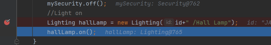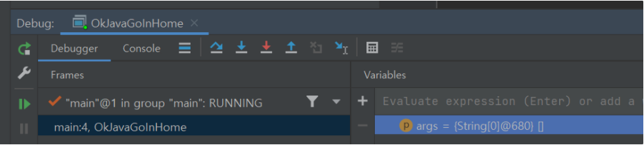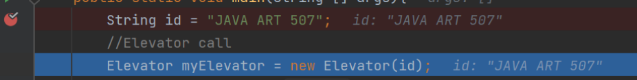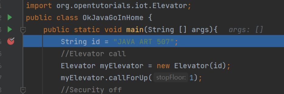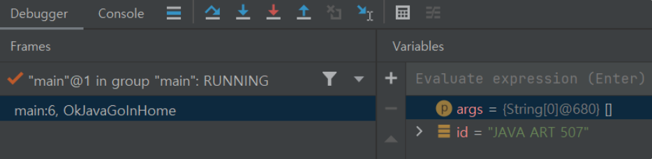 → Breakpoint가 빨간색 동그라미고, id에 값 할당 전까지 디버그한것이다. 변수도 아직 args에 대해서만 할당되었다.