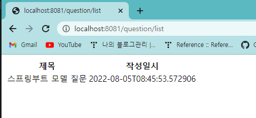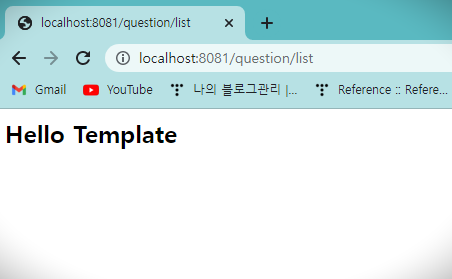 패키지 변경 후 QuestionController 에 작성한 "/question/list" URL로 접속하면 아래와 같이 템플릿이 정상적으로 뜨는것을 확인할 수 있다.