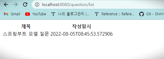 수정 후 http://localhost:8080/ 로 접속하면 아래와 같이 질문 목록 페이지가 보여지게 된다.