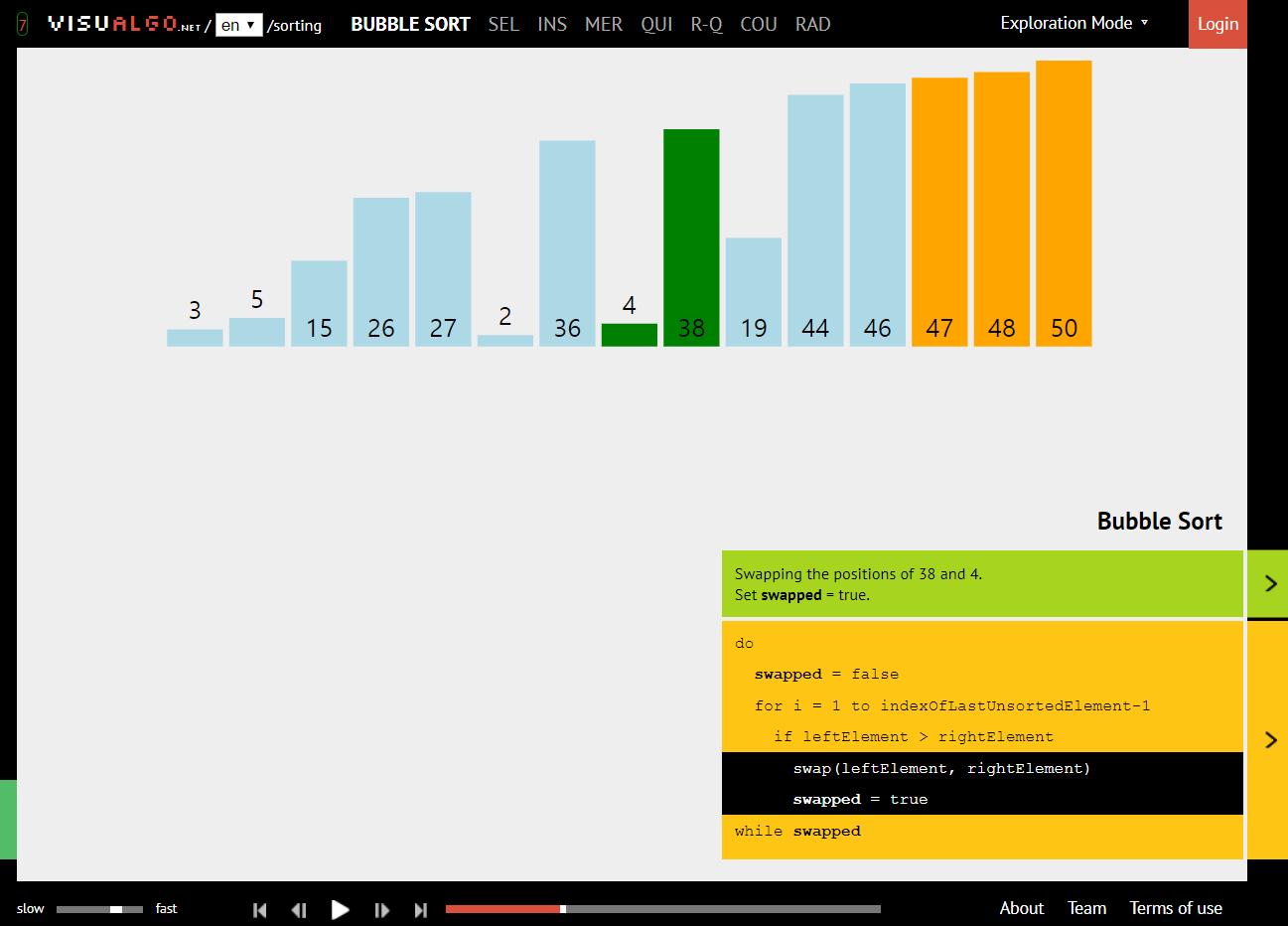 visualgo 는 정렬, 트리 등의 원리를 이해하기 쉽게 시각화하여 한 단계씩 나타낸 사이트이다.. 그림과 코드가 한 화면에 나오고, 재생 버튼을 누르면 순차적으로 for 반복문을 따라 알고리즘 진행 과정을 보여준다.