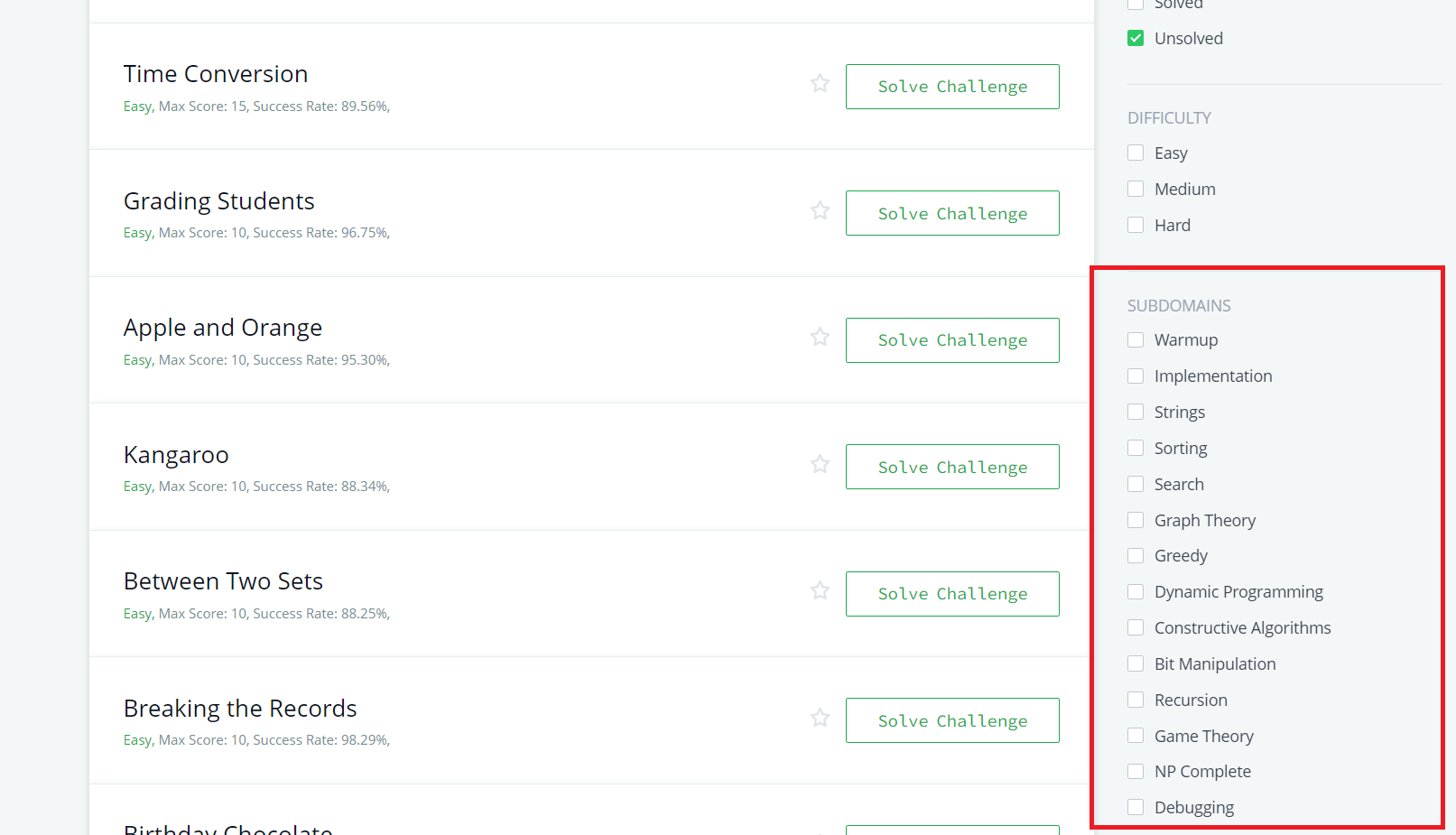 HackerRank 사이트 우측 하단에서 주제 별로 문제를 선택할 수 있는 모습.