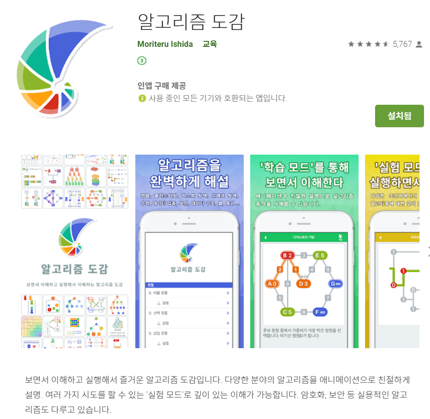 앱으로 완벽히 공부할 수는 없지만, 접근성이 좋은 것은 사실이다. 개인적으로 간단하고 쉬워서 도움이 많이 된 앱은 알고리즘 도감 이라는 앱이다. 위에 설명한 visualgo와 비슷하게 한 단계씩 천천히 알고리즘을 설명해주고, 간단한 예제도 지원해서 입문자에게 추천하고 싶은 앱이다.
