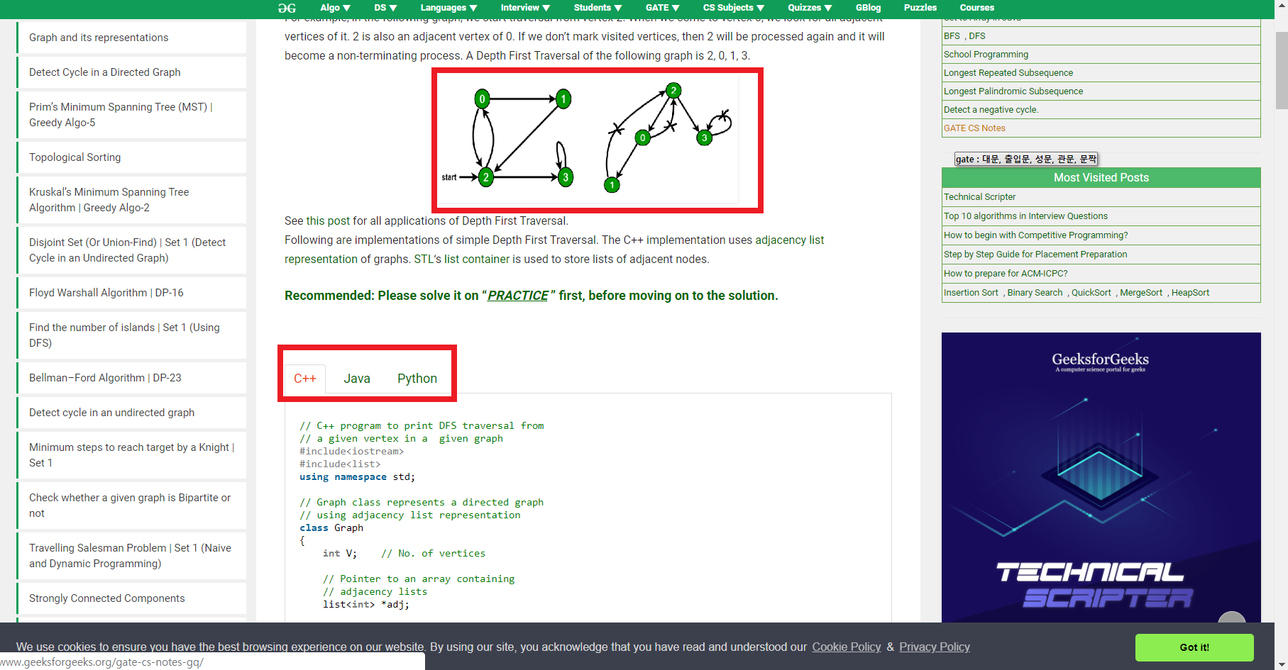 Geeksforgeeks 사이트는 영어로 되어있긴 하지만, 알고리즘 예시와 함께 C++, 자바, 파이썬 코드로 작성된 예시를 함께 볼 수 있어서 도움이 되었다.