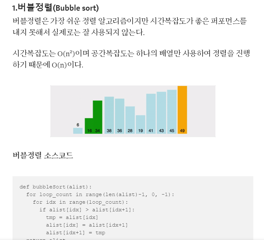 - 버블 정렬 - 가장 쉽지만, 시간 복잡도가 높아 효율적이진 않다.